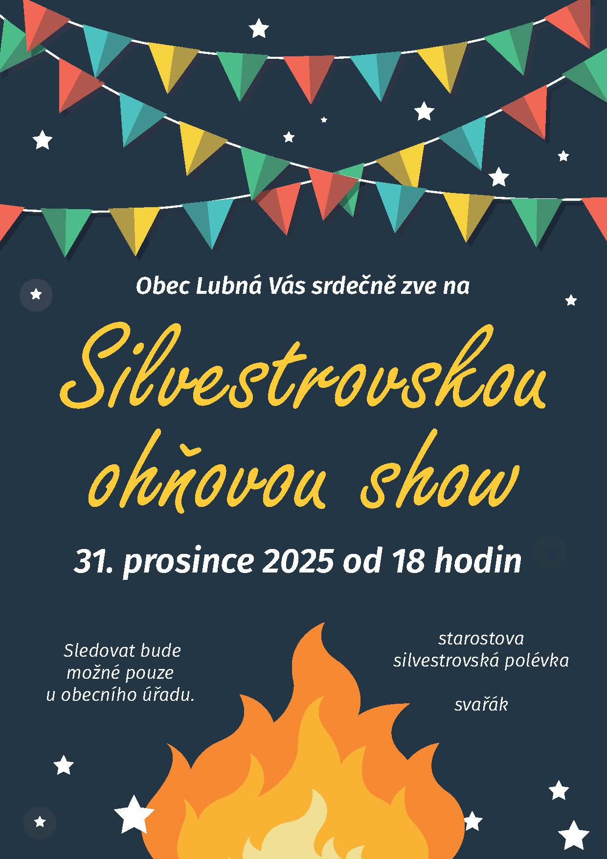 Pozvání na Silvestr - přijďte si společně užít jedinečnou atmosféru posledního večera v roce! Čeká nás originální ohňová show. Setkejme se, popřejme si vše dobré do nového roku a užijme si společný zážitek. I letos zůstává oblíbená starostova polévka a svařák lubenských žen. Show proběhne 31. 12. 2025 od 18:00 hodin před obecním úřadem v Lubné.